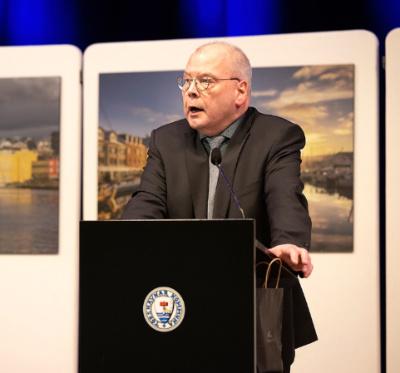 Vegna allan hin kommunala geiran fari eg at takka tær fyri títt trivaliga og dygga íkast til menningina av samfelag okkara. Havnin er ein heilt onnur í dag enn fyri hálvari øld síðan, táið tú gjørdi tína entré í valdshierarkinum á býarinnar politiska parnassos. Havnin og Føroyar hava í túsund ár ikki ment seg meiri enn tað sama sum hesi seinastu 50 árini, - eisini tær fyri at takka. Ludvík 14. – franski Sólkongurin – ráddi fyri borgum í 72 ár og 110 dagar. Um tú røkkur hansara starvsaldri er ivasamt, men ivast skal tú ikki í, at vit stórtrívast í samstarvinum, og fyri Kommunufelagið og meg sjálvan fari eg enn einaferð at takka tær fyri títt stóra íkast okkum øllum til frama, í vónini og væntanini um, at the never ending ferðin - úr bakskutinum á Havnarbátinum fram í rongina á samfelagnum - heldur fram við somu megi í ókomnum døgum, vikum og árum.
